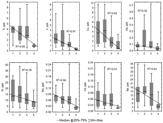 In order to examine differences in the concentrations of elements in bog waters with different hydrological regimes, we first ran the Kruskal–Wallis test and then the Wilcoxon–Mann–Whitney pair test (see Table A2 in Appendix A). According to the chosen statistical criteria, most parameters of the bog waters in fens with a watercourse (with hydrological regime 4) were found to be largely (p < 0.05) different from the values in other flowing waters. At the same time, the Cond, DOC, SO42–, Al, Ti, V, Cr, Cu, Ga, Sr, Nb, Mo, Cd, Cs, Ba, Th, U, and almost all REEs exhibited a clear trend of decreasing values (0.63 < R2 < 0.97, p < 0.05) from bog water polygons occupying elevated dry positions to the lower parts of the fens with a watercourse (Figure 6).