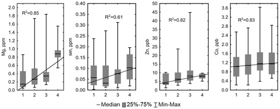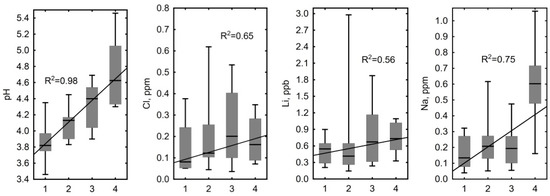 Concentrations of Cl, Li, Na, Mg, Mn, Zn, Co and pH values showed a clear statistically significant trend of increasing concentration (0.56 < R2 < 0.98, p < 0.05) in the bog waters of the KS Tazovsky (Taz) microtopes with different hydrological regimes: 1—polygons occupying elevated dry positions; 2—degraded and flooded polygons and small cracks between polygons; 3—large cracks and fens without a watercourse; 4—lower parts of the fens with watercourse. The solid line is a linear fit for all data with the regression equation given on each graph. It should be noted that the categories (1–4) are becoming increasingly wet from left to right.