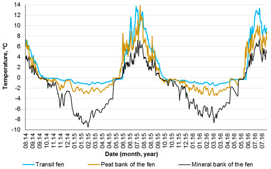 The indicated microtopes also differ in the thermal regime, which can affect peat leaching. Thus, it was shown that in the subarctic catchment, the DOC export is maximal among the cotton grass fens, and its productivity is twice as high as in the sphagnum bogs [26]. The fens have large reserves of heat, the permafrost there is always deeper or even absent, and, accordingly, the seasonal freezing is much shorter (Figure 8) than that on the adjacent polygons. This was confirmed by both our field measurements in Tazovsky (the mean annual temperature of peat at a depth of 5 cm is equal to –1.9 °C in mounds and +1.9 °C in hollows) and the observations of other researchers [18,61].
