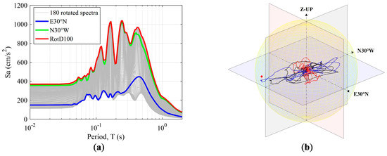 As can be seen in Figure 1a, the N30°W component has larger Sa values than E30°N but does not represent the RotD100 (Rot: rotated; D: period-dependent; 100: 100th percentile) spectrum well. RotD100 is the spectrum that represents the maximum (100th percentile) values of response spectra of the two as-recorded horizontal components rotated onto all non-redundant azimuths [13]. This is due to the directionality effect of strong motion recordings, which is now considered in the GMPEs [12,14,15] and in the variability of the performance of structures due to the angle of incidence of the seismic action [16,17,18,19].