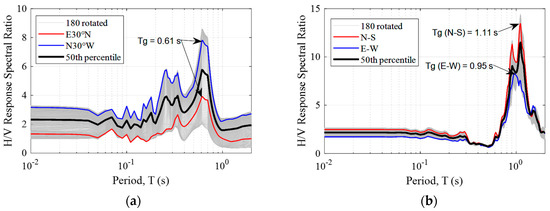 Horizontal-to-vertical (H/V) 5% damped response spectral ratio comparison for (a) the 11 May 2011 Lorca (Spain) earthquake recorded in the LOR station (5.1 Mw at 18:47:00 local time) and (b) the 24 February 2004 Alhucemas (Morocco) earthquake recorded in the ALG station (6.3 Mw at 02:27:47 local time).