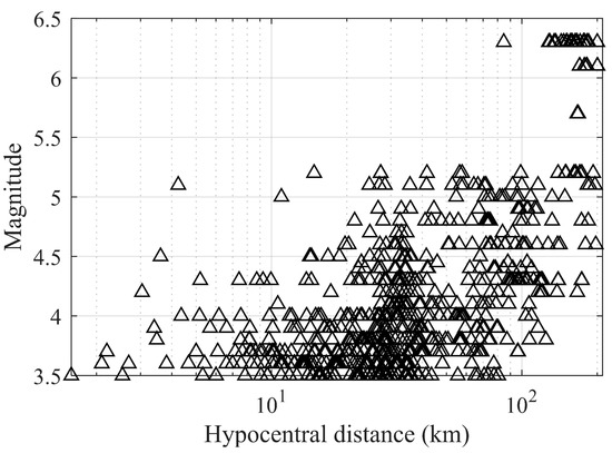 The distribution of magnitude as a function of the hypocentral distance of the selected ground motions is displayed in Figure 3 and the earthquake locations are shown in Figure 4. Most records correspond to earthquakes with magnitudes below 4 and with a hypocentral distance between 20 and 30 km.