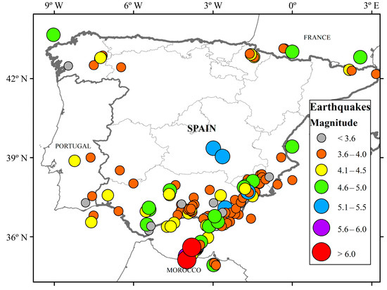 Earthquakes such as those in Sicily (Italy) in 1693 [20], Lisbon (Portugal) in 1755 [21], and Messina (Italy) in 1908 [22] were highly destructive events that left their mark on the European continent in the past. Over the last decade, a considerable number of high-magnitude earthquakes have occurred, causing property damage and fatalities. In Italy, the earthquakes of L’Aquila (Italy) in 2009 [23] and the Central Italian events of 2016 [24] caused around 600 fatalities and thousands lost their homes. In Spain, the Lorca 2011 earthquake is an example of how a moderate earthquake (Mw = 5.1) can produce significant damage with considerable economic loss, loss of homes, and fatalities [25,26]. This confirms the need to increase knowledge of earthquakes and provide advanced tools to improve the evaluation and management of seismic hazard and risk in Spain [27].