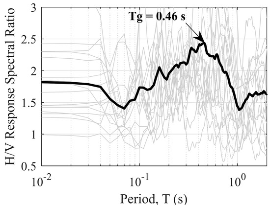 From the 692 ground motion records, only one has a peak ground acceleration (PGA) higher than 0.30 g (high seismicity), the 2011 Lorca earthquake recorded in the LOR station with a PGA = 0.36 g (see Figure 2a). Figure 5 shows the results of the H/V spectral ratios of the LOR station using all the available records. The median predominant period is 0.46 s compared to the 0.61 s period obtained in Figure 2a. This difference in the period is due to the high PGA of the motion, producing high deformations and leading to a nonlinear response of the soil [28,29,30,31].