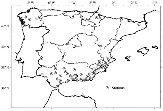 The location of the 86 analyzed stations are shown in Figure 6, and, in order to summarize the results obtained and to allow easy comparison with previous classifications, Table 4 shows the new and old site classifications. In this table, the classification based on the predominant periods, the geology (provided by the IGN), and the site classification published by Mezcua et al. [32] are shown. For the geology classification, R refers to rock, H to hard soil, and S to soft soil. To characterize each site, Mezcua et al. [32] used the crude site qualitative description provided for each station. Site class 1 corresponds to compact rocks, 2 refers to firm soil, and 3 applies to soft sedimentary deposits.