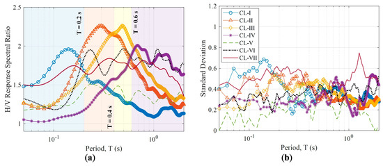 In the case of the standard deviations of the geometric mean of H/V response spectra ratios (Figure 7b), the results show values around 0.3 on average. These results are similar to those obtained by Zhao et al. [7], Fukushima et al. [8], Ghasemi et al. [10], and di Alessandro et al. [9].