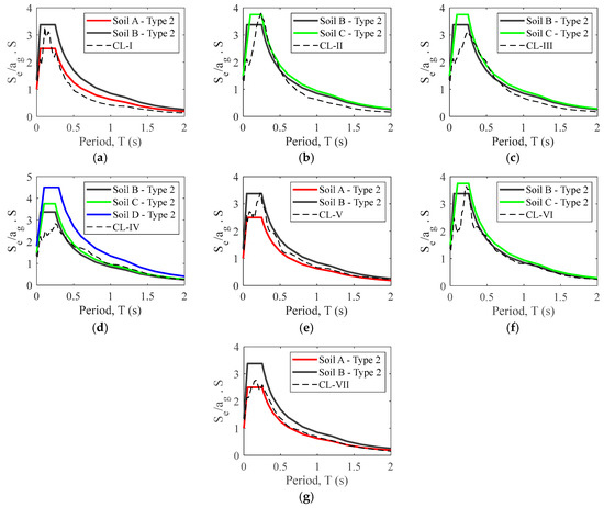 Comparison between the EC-8 Type 2 design spectra and the mean spectral shapes obtained for the site classes: (a) CL-I, (b) CL-II, (c) CL-III, (d) CL-IV, (e) CL-V, (f) CL-VI, and (g) CL-VII.