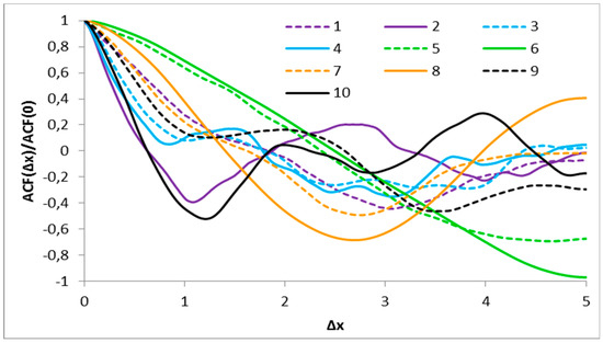 The normalized autocorrelation functions ACF(Δx)/ACF(0) as function of the distance Δx from 0 cm to 5 cm are shown in Figure 2 (labelled by the number of the profile).