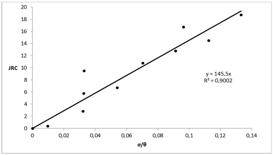 Characteristic of the autocorrelation functions of the profiles is the negative part. Negative parts always occur in the autocorrelation function of a single realization, even if the random field belongs by construction to a specific type, e.g., Gaussian with Gaussian correlations. Therefore, if one is given a single realization of the field, the best way to proceed is by best fitting the obtained correlation/variance function to suitable model function. The Gaussian model correlation used here was chosen among various simple models (e.g., Markovian, white noise, triangular and cubic correlations; see [23]) as the one which performed the best. The quantity σ/θ is given in Table 2 for each roughness coefficient JRC. Moreover, the JRC-σ/θ relationship has been drawn in Figure 3. The R-squared of this relationship was only 3% smaller than the respective one given in Figure 1, also by the authors, for the respective JRC-logZ2 relationship. Both relationships have been extracted from the same figure (Barton and Choubey’s [4]) without involving fine tuning of the digitization.