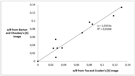 The same has been done but for the JRC-σ/θ relationship. As shown in Figure 5, there is a much greater consistency between the estimates. The level of consistency is additionally shown by plotting the two sets of results against each other. Figure 6 shows the results for logZ2, whilst Figure 7 shows the results for the σ/θ index introduced in present work. For the case of σ/θ, the higher R2 value has been noticed, and also the proximity of the slope of the best fit to the value of 1. The reason why the σ/θ index appears to be more stable than the index Z2 might be described as follows. Z2 contains the information contained in ACF(Δx) for equal Δx to the length of the interval between sampling points, i.e., the infinitesimal interval of the given digitation. On the other hand, θ is estimated employing the information contained in ACF(Δx) over all meaningful correlation distances. Apparently, the latter feature operates as a regularizing factor smoothing those errors present in the Z2 estimate.