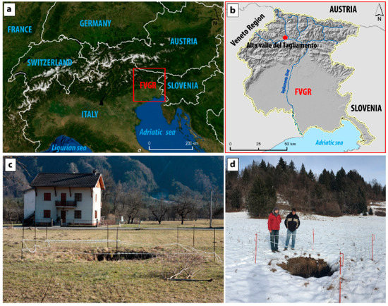 (a) Study area location in the European environment; (b) location of the study area (red dot) in the FVGR correspond to the Quins hamlet, in blue the Tagliamento River; (c) a cover collapse sinkhole occurred in 2013 in the western side of Enemonzo municipality; (d) a cover collapse sinkhole occurred in 2017 on the north-eastern side of Enemonzo municipality.