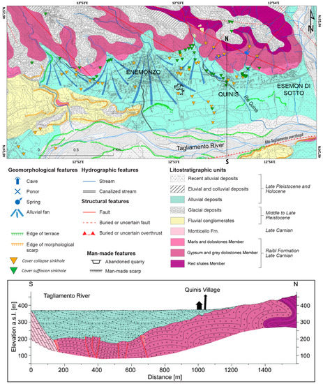 From a lithological viewpoint, in the FVGR, two main evaporitic events were recognized, one occurred during Permian, the other during Late Carnian [49]. The related outcrops are not always identifiable, being mostly mantled by alluvial and colluvial deposits. In the study area, the unit containing evaporites is represented by the Raibl Formation (Upper Carnian), mainly covered by fluvial and deltaic conglomerates, glacial tills Pleistocene in age and fluvial Holocene gravel and sand, clastic debris and/or alluvial fans.