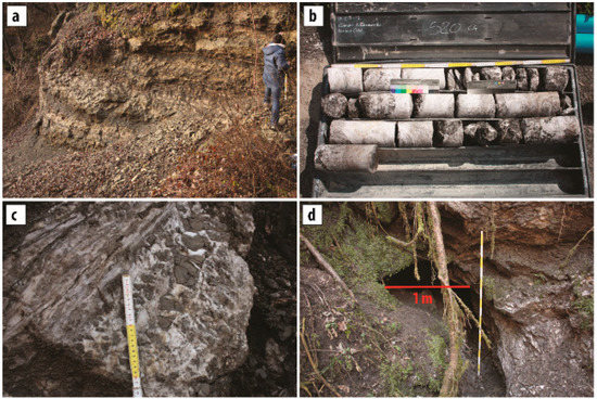 (a) silt stones and red shales from Membro a peliti rosse; (b) core-drilling samples collected while drilling PZ20 piezometer into the Membro a gessi e dolomie grigie; (c) particular of a warped gypsum with marls fragments; (d) cave entrance (in red the dimension) present along one of the small stream with no name, tributary of the Rio Quinis stream, a surface drainage of the (Tagliamento River). Photo credit: E. Zavagno.