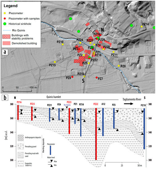 (a) Location map of the piezometers present in the area of Quinis and the ones where rock samples at different depths were installed (in red). In the centre of the area, the trace of the simplified cross-section presented in Figure 4b; (b) simplified lithostratigraphical cross-section (modified after [11]) of the bedrock and the mantling deposits (prevailing mud with sand, prevailing gravel and anthropogenic deposits). The section is NE-SW oriented. In red, six of the seven piezometers involved in the field experiment.