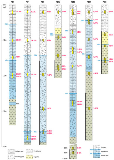 Rock samples were installed in PZ8 and PZ16, but no diver was present in those piezometers. Data from previous studies [11,53] (Figure 6) suggested that water level and fluctuations occurring in PZ8 are superimposable to the ones of PZ7 and for this reason only PZ7 was chosen for the diver installation. Having PZ16 a very stable behaviour of the water level (Figure 6), no diver was installed there.