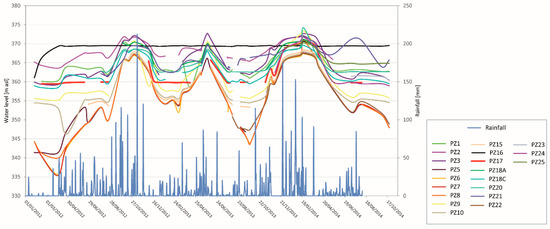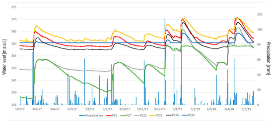 Data-logger water level measurements in the period April 2017–May 2018 with respect to the precipitations occurred in the study area in the piezometers PZ3, PZ7, PZ22, PZ23, PZ24 and PZ25.