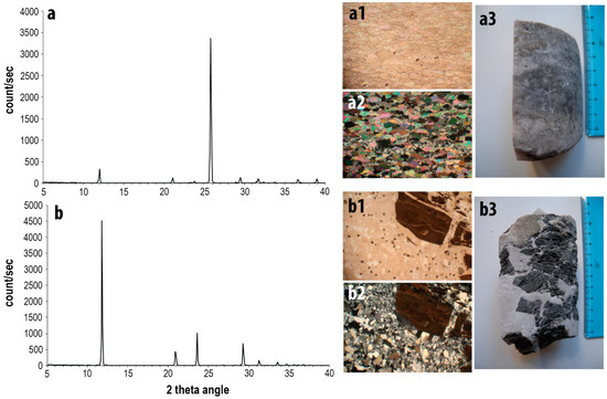 X-ray powder diffractograms of the analysed samples. (a) evaporite fragment in PZ22, showing the presence of anhydrite; (a1,a2) thin section of fragment from PZ22, parallel nicols above and cross nicol below showing the dense structure of the anhydrite; (a3) the evaporite sample used for thin section consisting of rhythmic alternations of thin gypsum and anhydrite layers (withe) interspersed with marls and clayey layers (black); (b) evaporite sample in PZ3, showing the presence of gypsum; (b1,b2) thin section of fragment from PZ3, parallel nicols above and cross nicol below, in the gypsum mosaic structure it is also possible to recognize some marl clasts; (a3,b3) the evaporite sample used for thin sections, clayey and marls fragments are immerse in a gypsum matrix.