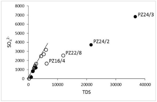 TDS (mg/L) vs. SO42− (mg/L) correlation diagram. Symbols are: open circle: piezometers with evaporite-rock fragments inside; filled circle: piezometer without evaporite-rock fragments inside. The linear best-fit for waters, excluding the labelled (Na-Cl) samples, is also shown (R2 = 0.97, dashed line).