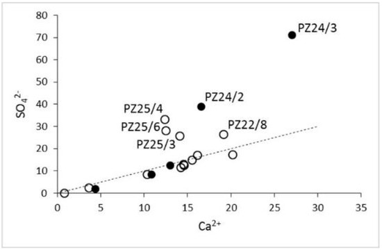 Ca2+ (mol/L) vs. SO42− (mol/L) correlation diagram. The SO42−/Ca2+ = 1 stoichiometry is shown (dashed line). Waters that deviates towards a relative sulphate enrichment are labelled. Symbols as in Figure 9.