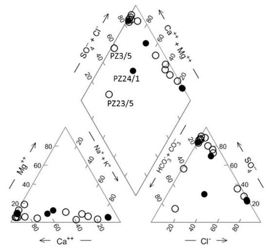 The proportions (in equivalents) of the major cations [Ca, Mg, (Na+K)] and anions (alkalinity, totally expressed as HCO3−, chloride, sulphate) are displayed in the Piper diagram (Figure 11 [66].