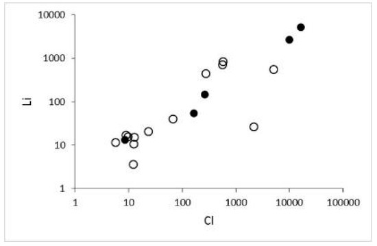 Cl (mg/L) vs. Li (µg/L) correlation diagram. Symbols as in Figure 9.