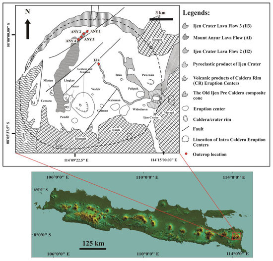 The Ijen Volcanic Complex map shows the distribution of volcanic products and eruption centers. Red dots indicate the sampling sites (modified from reference [25]).
