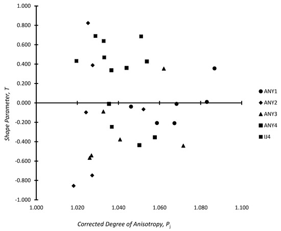 A plot of shape parameter (T) and the corrected degree of anisotropy (Pj). Positive values indicate an oblate shape, whereas negative values indicate a prolate shape.