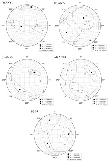 The maximum axes in all samples generally clustered, except for ANY1 and ANY2, whereas the maximum axes were more scattered and had wider circles of confidence. Intermediate axes were always scattered with shallow inclination or had a low level of confidence. ANY3 and ANY4 had the highest level of confidence for their maximum axes.