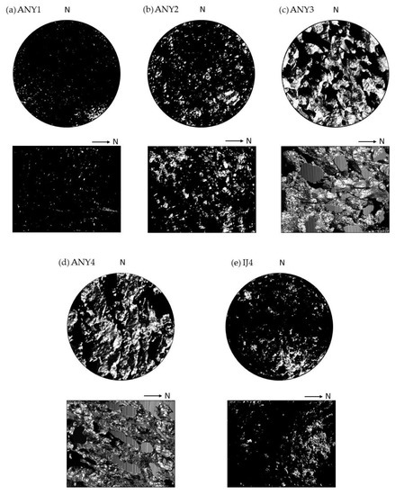Table 5 shows the calculated preferred pore orientation for each sample. In order to find the correlation between AMS and pore orientation, we calculated the angle between the preferred orientations and all susceptibility axes of each sample using Stereonet program (developed by Richard Allmendinger) [42,43] (Table 5). The axis with the smallest gap to the preferred pore orientation of each sample is assumed to imply the lava flow direction. Following this assumption, it can be observed that the flow directions of ANY2 lay closer to the maximum axes, while it is closer to the minimum axes for ANY1, ANY3, ANY4, and IJ4.