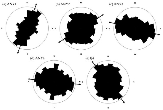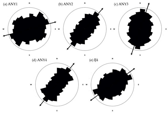 Rose diagrams of horizontal slices of (a) ANY1; (b) ANY2; (c) ANY3; (d) ANY4 and (e) IJ4 specimens that were used in μCT imaging. These diagrams show the distribution of the declination of pores orientation. Vertical axis represents North-South direction while horizontal axis represents East-West direction. Black arrows indicate the declination preferred pore orientation.