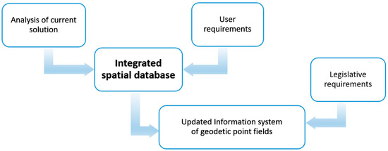 The rest of the paper is structured as follows: Section 2 describes the used methodology aiming to develop the integrated spatial database of geodetic point fields. The development is based on the analysis of the current solution, which is discussed in Section 3. Section 4 and Section 5 describe the user and legislative requirements. The details about the integrated spatial database and the prototype of the Information system of geodetic point fields are given in Section 6 and Section 7, respectively. The conclusions are mentioned in Section 8.