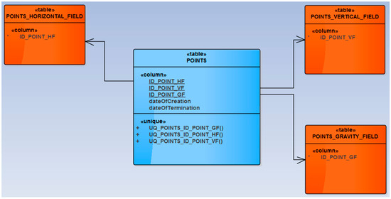 It has to be said that in the proposed integrated database, each point still has the same identifier as it had in the previous system, so the continuity is ensured. These IDs are used in the joining POINTS table for reference purposes as described in the Figure 2. Furthermore, no new coordinates are stored in the POINTS table. The coordinates of the points were loaded from the previous databases and now are stored in corresponding tables—for points belonging to the horizontal point field in the table POINTS_HORIZONTAL_FIELD, for points belonging to the vertical point field in the table POINTS_VERTICAL FIELD and for the points belonging to the gravitational field in the table POINTS_GRAVITY_FIELD. If the geodetic point belongs to more than one kind of geodetic field (e.g., horizontal and vertical), then the identifiers of this point are stored in the POINTS table in corresponding attributes, in this case attribute ID_POINT_HF (referencing the table POINTS_HORIZONTAL_FIELD) and attribute ID_POINT_VF (referencing the table VERTICAL_HORIZONTAL_FIELD).