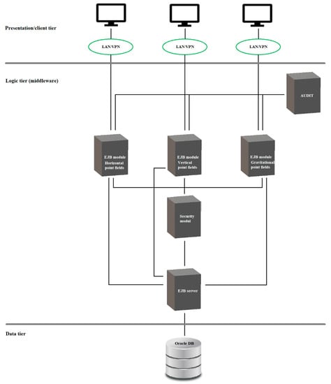 The Information system of geodetic point fields (ISGPF) is a subsystem of the Information System of Land Surveying (ISLS). ISLS serves to land surveying activities, which are realized in the public interest. According to the Czech cyber-security law (Act No. 181/2014 Coll.), both ISLS and ISGPF are considered to be crucial information systems of public administration. Due to this fact, these systems have to implement certain cyber-security features. Security is an important topic in information systems and their applications, especially within the Internet environment [27]. The threat of cyber-attacks is getting greater and due to the increasing use of computers, criminal activity has also changed from physical to cybernetic intrusion [28]. Security and access for users is driven by the security module, which is a part of the middleware layer as expressed in Figure 3. The procedures are defined in the security policy for logging in and out to prevent unauthorized access. Only a limited group of users is allowed to store and update the data in the database. Their identities are verified by logging into the domain within an internal network of the administrator of the database. After the user is logged in, they have access to the precisely defined functions based on the granted rights. Regarding the ISGPF and the new integrated spatial database of geodetic point fields, the following basic principles of safety management were applied: