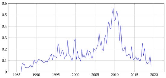 We compare the earthquake prediction probabilities obtained using different fields of features in Table 1: is the forecast probability using the earthquake density field 2D (), is the probability using the 3D field of negative earthquake density anomalies (), is the probability of forecast by 2D field of earthquake epicenters density, obtained using the Gutenberg–Richter model, and is the probability using and fields. We can see that the highest probability of a successful forecast occurs when the fields and are used together. When (), the ratios for the prediction probability obtained with and fields to the prediction probabilities obtained with 2D earthquake density field () and for the field calculated using the Gutenberg–Richter ratio, are equal respectively and . Table 1 shows the values of two types of alarm volumes: is the alarm volume received in accordance with the training data, and is the alarm volume corresponding to the alarm volume but observed on the test data. You can see that when testing in almost all cases, except for testing the 2D-field , the volumes of are greater than . This is explained by the fact that the number of recorded earthquakes in a region changes over time (Figure 1). The number of earthquakes is influenced by the development of a seismic network and natural changes in the seismic process. The Figure 1 shows that the number of earthquakes increases significantly in the test interval. The same anomaly appears on the plot of the time series of average values of the density of earthquake epicenters throughout the analysis area (Figure 2). An increase in the density of earthquake epicenters leads to an increase in the field values of the function, which ultimately leads to an increase in the volume of anxiety during testing.