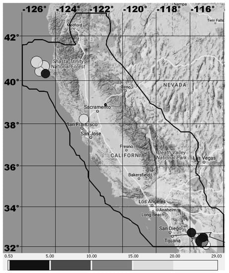 Figure 3 and Figure 4 show the test results for both regions. They depicted polygons selected as the area of analysis, and circles are the target epicenters of earthquakes in 2009–2018 with for Mediterranean and for California.