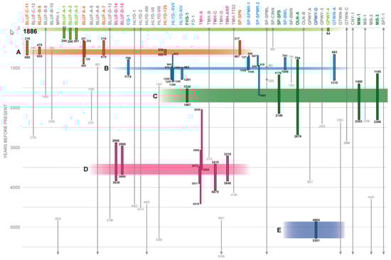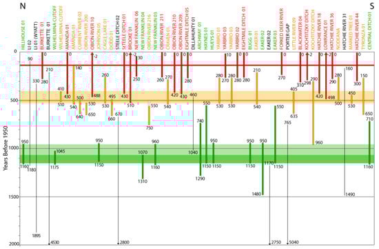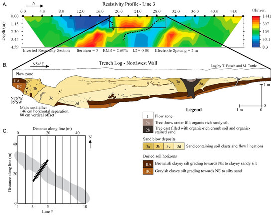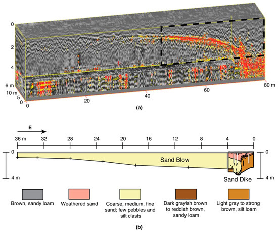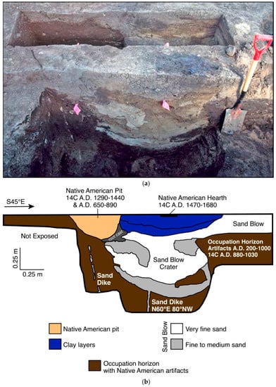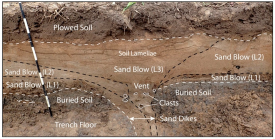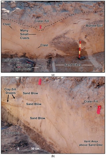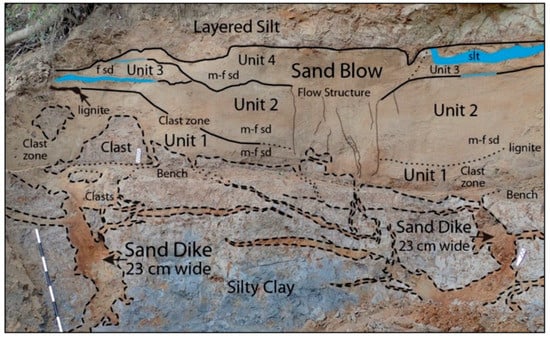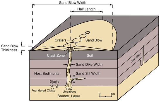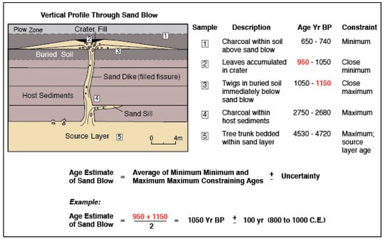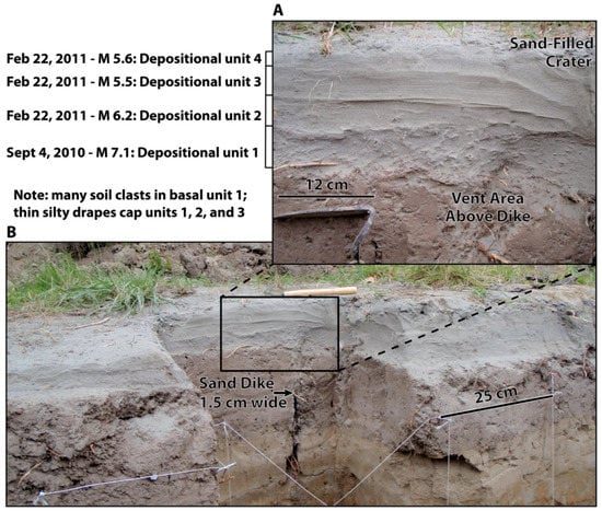 - Chronological control: Paleoearthquakes are identified based on grouping of paleoliquefaction features that have overlapping age estimates (e.g., References [5,6,7,8,12,29,109,117,118]. As described above in Section 3.3.1, sand blows usually provide the best chronological control because the event horizons (e.g., soil horizons buried by sand blows) are more easily identified and their age estimates are usually better constrained, whereas the event horizon and age estimates associated with sand dikes are often poorly constrained.