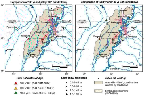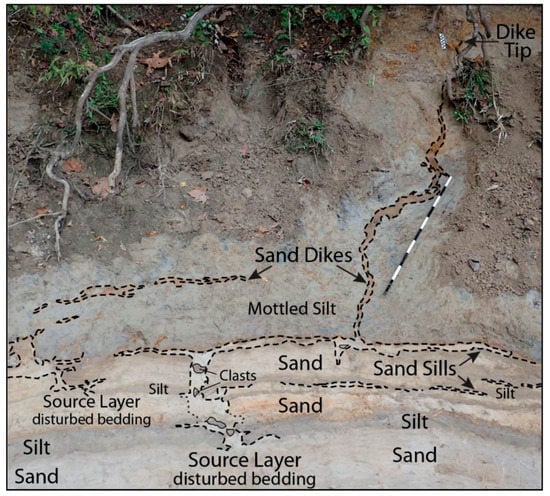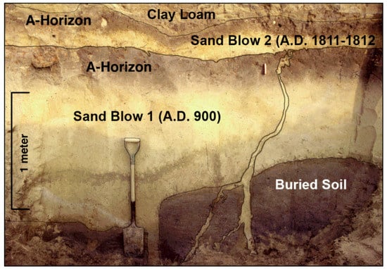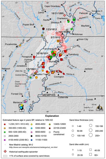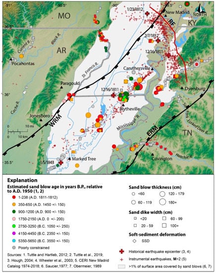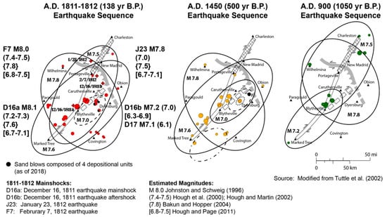 - Tuttle, M.P. Search for and Study of Sand Blows at Distant Sites Resulting from Prehistoric and Historic New Madrid Earthquakes: Collaborative Research between M. Tuttle & Associates and Central Region Hazards Team; Final Technical Report to US Geological Survey: NEHRP Award 02HQGR0097; Reston, VA, USA, 2010; p. 48. Available online: https://earthquake.usgs.gov/cfusion/external_grants/reports/02HQGR0097.pdf (accessed on 11 July 2019).