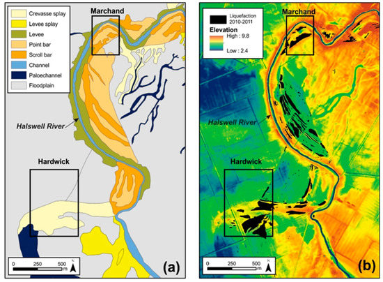 - Giona Bucci, M.; Villamor, P.; Almond, P.; Tuttle, M.; Stringer, M.; Smith, C.; Ries, W.; Watson, M. Associations between sediment architecture and liquefaction susceptibility in fluvial settings: The 2010–2011 Canterbury earthquake sequence, New Zealand. Eng. Geol. 2018, 237, 181–197. [Google Scholar] [CrossRef]