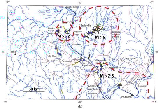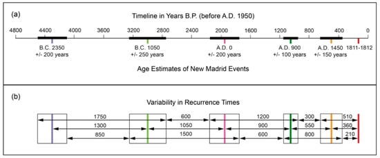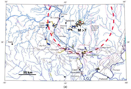 - Saucier, R.T. Geoarchaeological evidence of strong prehistoric earthquakes in the New Madrid (Missouri) seismic zone. Geology 1991, 19, 296–298. [Google Scholar] [CrossRef]