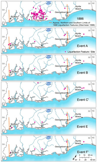 - Amick, D.; Maurath, G.; Gelinas, R. Characteristics of seismically induced liquefaction sites and features located in the vicinity of the 1886 Charleston, South Carolina earthquake. Seismol. Res. Lett. 1990, 61, 117–130. [Google Scholar] [CrossRef]