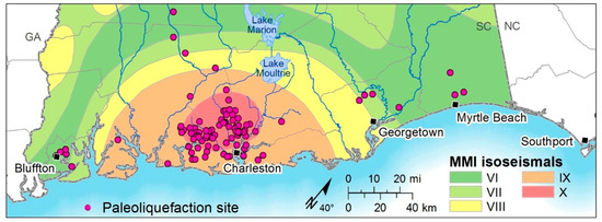 - Talwani, P.; Cox, J. Paleoseismic evidence for recurrence of earthquakes near Charleston, South Carolina. Science 1985, 228, 379–381. [Google Scholar] [CrossRef]