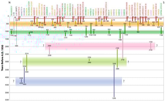 - Tuttle, M.P.; Lafferty, R.H., III; Guccione, M.J.; Schweig, E.S., III; Lopinot, N.; Cande, R.F.; Dyer-Williams, K.; Haynes, M. Use of archaeology to date liquefaction features and seismic events in the New Madrid seismic zone, central United States. Geoarchaeology 1996, 11, 451–480. [Google Scholar] [CrossRef]