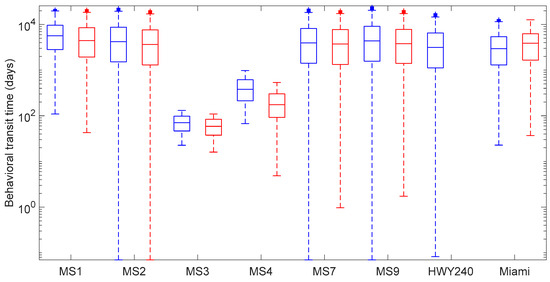 Distribution of behavioral transit times for δ18O (blue boxes) and δ2H (red boxes) tracers at the eight study outlets. Solid horizontal lines within each box show the median value. Small plus signs beyond whiskers are statistical outliers. Y-scale is log transformed to improve readability.