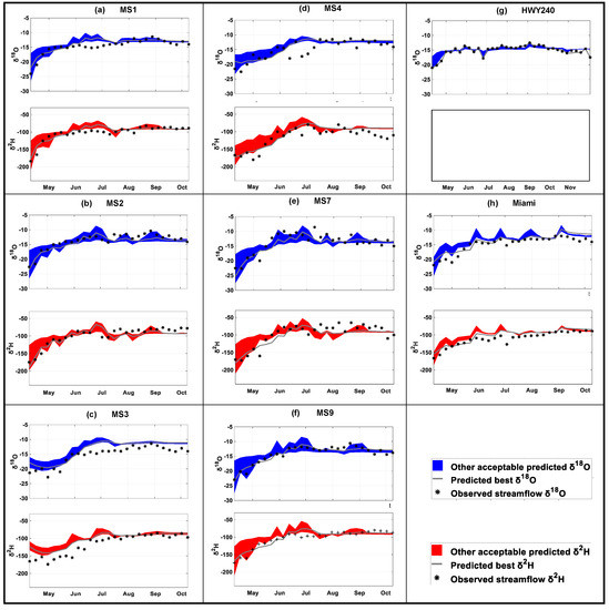 The maxima of the transit time distribution (TTD) at the outlets appear to be higher for the δ18O category than the δ2H, the only exception being at the Miami outlet. In contrast, the minima TTDs appear to be generally lower for the δ2H class than for δ18O (Figure 2). The maximum TT was about 10,000 days for the δ18O class and about 9900 days for the δ2H class. A spearman’s rank correlation analysis of the maximum TT across the eight sites showed no significance at the 95% level between the δ18O- and δ2H-based TTs (Rho = 0.61; p-value = 0.38). The maximum TT values across the studied outlets appear to occur at outlets MS1 and MS9 for each tracer class (Figure 2). The minimum TT was 80 days and 70 days, respectively, for the δ18O and δ2H class, both occurring at site MS3. The median TTs were higher within the δ18O class at all the outlets except Miami (Figure 2). Within the δ18O class, the highest median TT was about 6000 days and occurred at outlet MS1. A total of 4000 days was the highest median TT within the δ2H category, and it also occurred at outlet MS1 (Figure 2). There were no marked differences in the ranges of TT values between the δ18O and δ2H classes across the sites, since the tracer specific boxes appear similar in size. All TT outliers appear to be on the upper end of the distribution in each tracer category, with values above 11,000 days (Figure 2). The only outlets without TT outlier values were MS3, MS4, and the δ2H-based tracer class for Miami (Figure 2). There was generally a lower percentage of behavioral TT (out of the 50,000 MC runs) within each δ18O and δ2H class across all the eight outlets; with values at MS3 and MS4, for instance, being less than 2% (Table 1). There was no behavioral TT parameter at outlet HWY240 within the δ2H class (Figure 2 and Figure 3; Table 1). In general, across all the outlets, there was a higher number of behavioral parameters within the TTD of the δ18O tracer than there was for δ2H (Table 1). The GLUE bound appears to show some seasonality in the prediction of the δ output variable; the uncertainty band is bigger during the freshet and smaller as the season progresses into summer and fall (Figure 3).