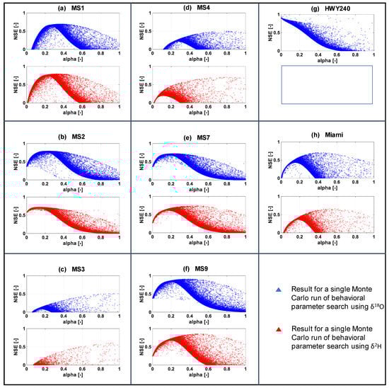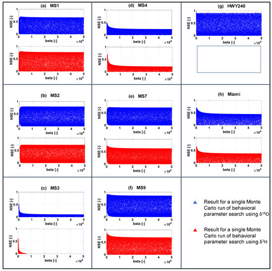 δ18O- and δ2H-based results of Monte Carlo simulations for scale parameter identifiability. Note that filled triangle symbols may not be discernible in the figure due to the number of simulations.