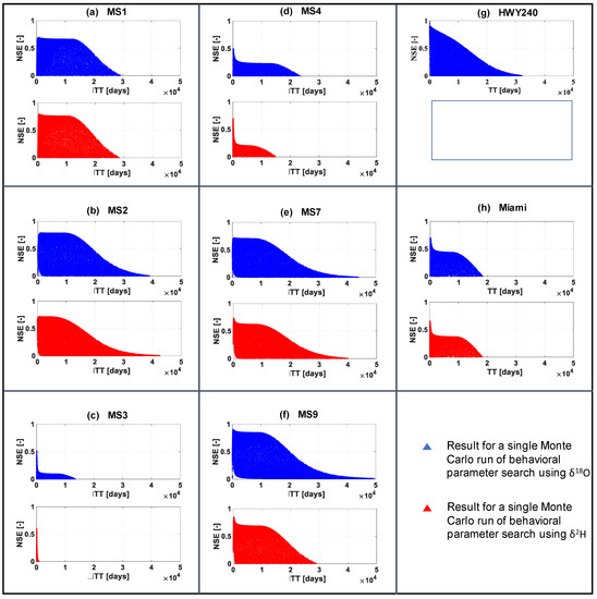 The α (shape factor) values corresponding to the best NSE score at the outlets ranged from 0.04 to 0.93 for the δ18O-based tracer and 0.14 to 0.93 for the δ2H-based tracer (Figure 4; Table 1). The β (scale factor) counterparts were 2 to 4747 for the δ18O-based tracer and 50 to 3701 for the δ2H-based counterpart (Figure 5; Table 1). The highest α, corresponding to the highest NSE, occurred at outlet MS3 in both tracer classes whiles the lowest occurred at outlet HWY240 within the δ2H class. Within the δ18O class, the highest β, corresponding to the highest NSE, occurred at outlet MS2 while the lowest occurred at HWY240. The highest δ2H-based β also occurred at outlet MS2 while the lowest occurred at outlet MS3 (Table 1). The time-step for the convergence on the best α at all the eight outlets matches the time-step for converging on β (Table 1). In general, and within each tracer class, the simulation appears to be converging on the best behavioral α and β at later time-steps (beyond time-step 25,000) (Table 1). The absolute MTTs from the δ18O- and δ2H-based tracers were different except for the value at the Miami outlet (95 days for both tracer categories) (Figure 6h). In general, the MTT of the catchments in this study were less than 9 months (Table 1). However, tracer specific MTTs at the outlets were, different. A significance test at the 95% level did not show any association between δ18O- and δ2H-based MTT results (Rho = 0.56; p-value = 0.21). However, when the tracer specific MTTs were ranked in increasing order, five out of the eight outlets matched (Figure 7).