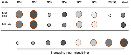 Ranking of the study outlets according to the δ18O- and δ2H-based mean transit times. The size of each dot is weighted according to the mean transit time.