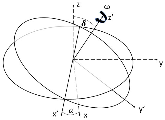Euler angles describing spin axis orientation with respect to the ICRF. The axes of the ICRF are denoted by (x, y, z), while the axes of the body-fixed frame are given by (, , ).