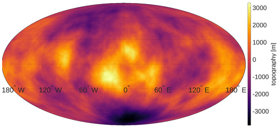 When using the spherical harmonics expansion, Method 1, it is sufficient to generate topography up to degree . For Method 2, when inverting B-splines on a rectangular grid, we generated the topography up to . Overall we tested three different power laws with m and , m and , as well as m and , respectively. The resulting topography for the version with is depicted in Figure 2. Power law models with give a rather rough topography, which means by consequence that we are left with more topography that is not modeled at the end of the analysis, increasing the uncertainty of the overall solution. For comparison, for Earth and Venus [35]. Only limited topographic data on Ganymede is available to confidently state which power law applies. However, the power law with yields rather rough topography with amplitudes exceeding 20 km. Since such topographic variations are not observed on Ganymede, we considered only for Method 1 and discarded this option for Method 2.