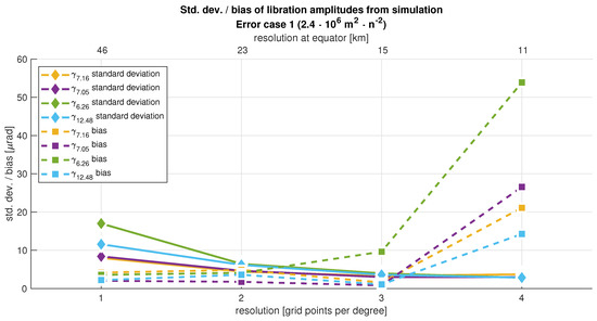 For the inversion based on a spherical harmonic expansion we solved for the 7-day, 50-day, and 483-day period since similar frequencies (e.g., 7.05 d and 7.16 d) cannot be distinguished by the inversion routine. We find that the differences of the true and recovered libration amplitudes are highly dependent on the degree of the expansion. The root-mean-squared errors of the libration amplitudes show a strong hyperbolic decay with increasing inversion degree. The retrieved uncertainties when simulating the topography up to degree and order 200 and solving for degree 60 (case 1) are given in Table 1. The result for the rotational state is shown in comparison to the case where the topography has been simulated and solved up to degree 60 (case 2). As can be seen from the results, the artificial elimination of the omission error for the case 60-60 increases the precision of the retrieved libration amplitudes by two orders of magnitude.